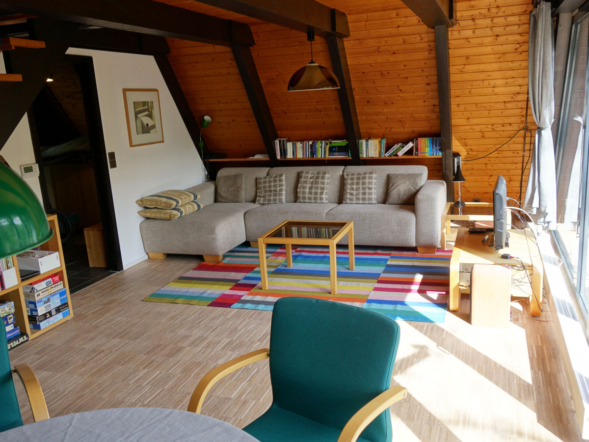 Das Wohnzimmer mit Blick auf den Balkon und die Essecke